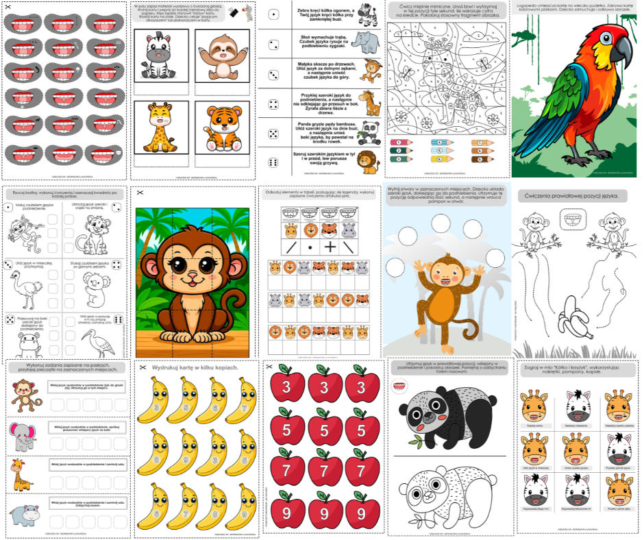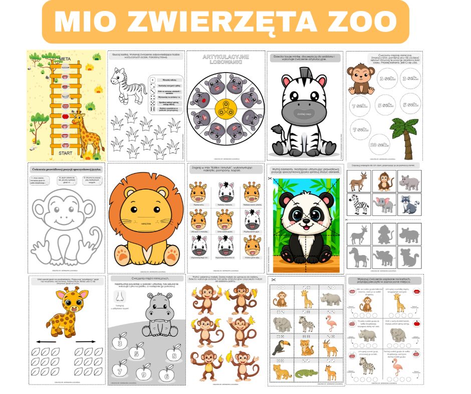 Mio Zwierzęta Zoo to kreatywne i interakcyjne pomoce do wykorzystania w terapii logopedycznej. Co wyróżnia naszą MioPakę? Przede wszystkim to, że aktywizuje pacjenta do efektywnych ćwiczeń miofunkcjonalnych. Paka zawiera karty do wyklejania, kolorowania, uzupełniania pieczątkami, naklejamy, ale także ma szereg zabaw ruchowych. Znajdziesz tutaj gotowe wklejki do zeszytu, jak również pomysły na aktywne utrwalanie ćwiczeń.