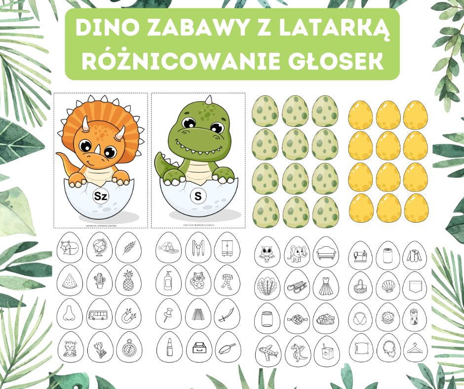 Dino zabawy z latarką. Różnicowanie głosek syczących i szumiących będą świetnym pomysłem na uatrakcyjnienie zajęć podczas Dnia Dinozaura. W zestawie znajdują się 2 szablony dinozaurów, które na brzuszkach mają specjalne miejsce do wsadzania jajek oraz 4 karty z kolorowymi jajkami oraz czarno-białe karty z materiałem obrazkowym. Dziecko losuje jajko podświetla obrazek i decyduje jaką głoskę słyszy w wyrazie, po czym wkłada jajko do odpowiedniego dinozaura.