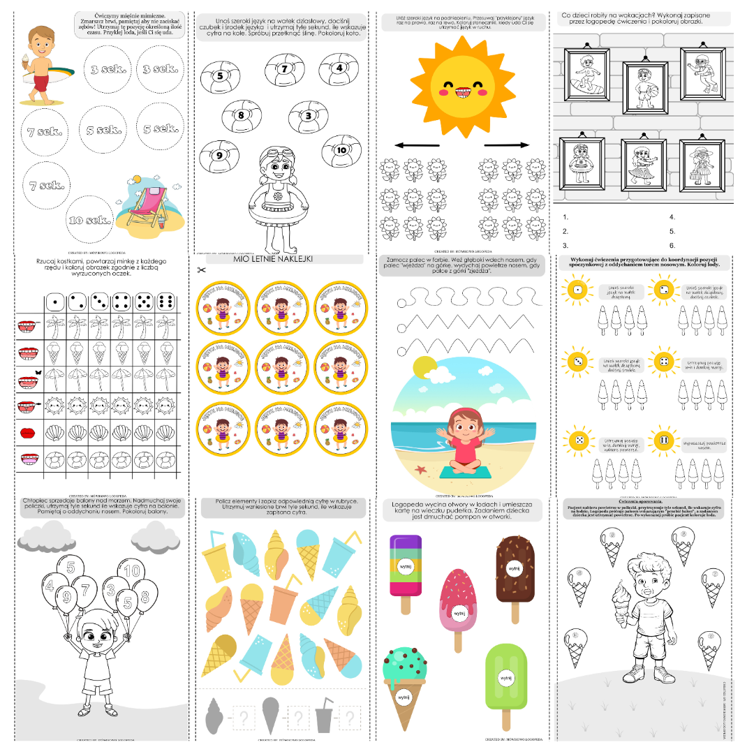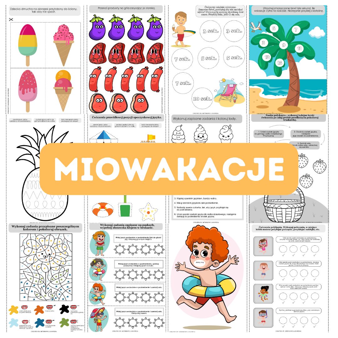 MioWakacje logopedyczna to kreatywne i interakcyjne pomoce do wykorzystania w terapii logopedycznej. Co wyróżnia naszą pakę MioWakacje? Przede wszystkim to, że aktywizuje pacjenta do efektywnych ćwiczeń miofunkcjonalnych. Paka zawiera karty do wyklejania, kolorowania, uzupełniania pieczątkami, ale także ma szereg zabaw ruchowych. Znajdziesz tutaj gotowe wklejki do zeszytu, jak również pomysły na aktywne utrwalanie ćwiczeń.