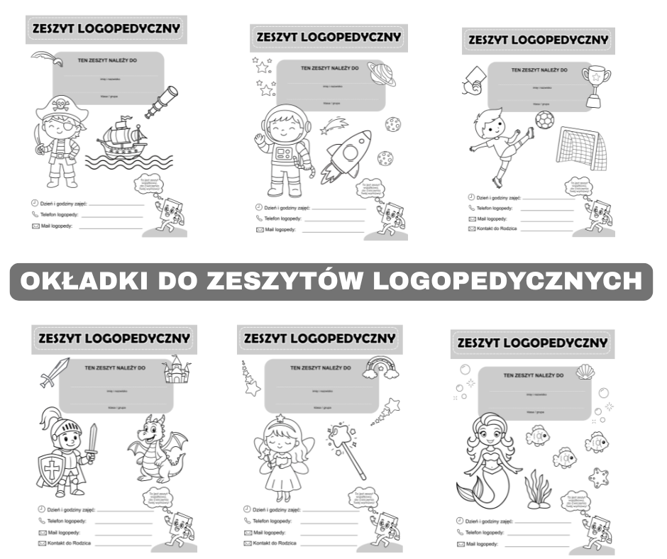 Okładki do zeszytów logopedycznych to zestaw 17 tematycznych okładek dla dzieci w wieku przedszkolnym i młodszym szkolnym. W zestawie: