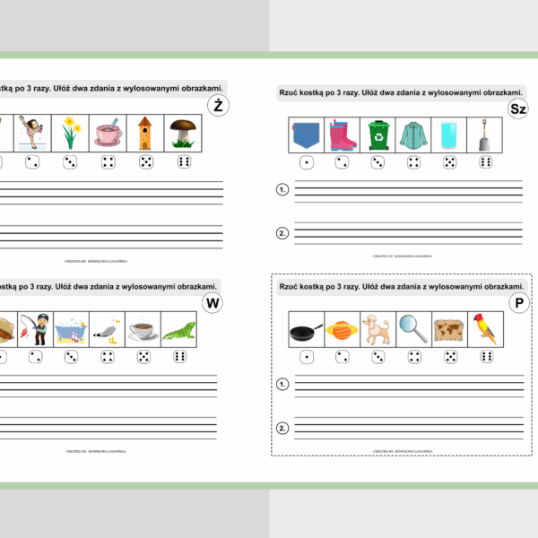 Dodatkowo w pace zawarte są ćwiczenia różnicowania głosek, a także czyste szablony do dowolnego uzupełniania materiałem językowym.