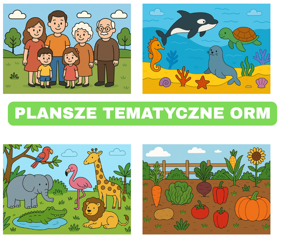 Plansze tematyczne ORM to zestaw 21 kolorowych arkuszy ilustrujących kategorie tematyczne do pracy nad opóźnionym rozwojem mowy.