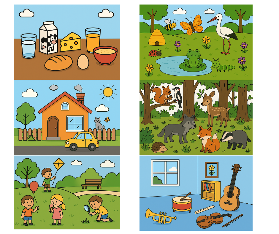 - zwierzęta (las, morze, łąka, wieś, zoo),
