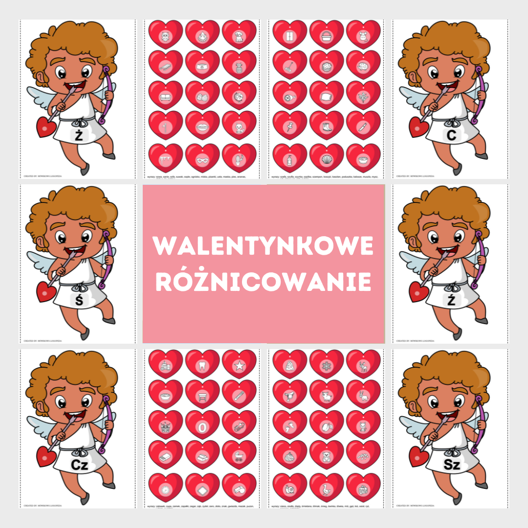 Walentynkowe Różnicowanie Głoski Dentalizowane będzie świetnym pomysłem na uatrakcyjnienie zajęć podczas Walentynek. W zestawie znajdują się szablony kart Amorków opisane głoskami oraz serduszka z materiałem obrazkowo – wyrazowym. Zadaniem pacjenta jest wylosowanie serduszka, powtórzenie wyrazu i zdecydowanie, jaka głoska się w nim znajduje. Następnie dziecko nawleka serduszko na sznurek do odpowiedniego Amorka.