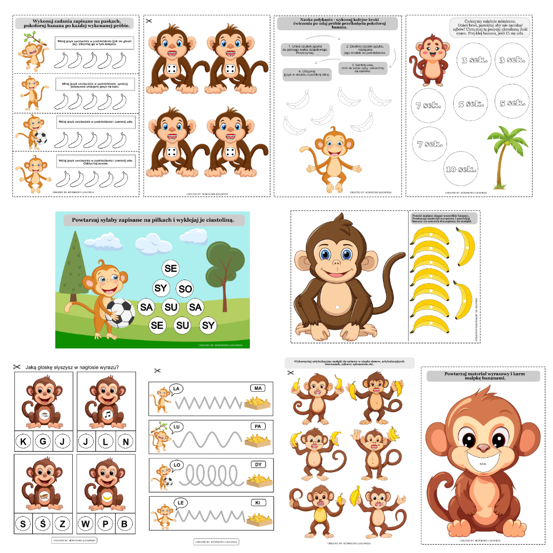 To komplet kreatywnych pomocy logopedycznych do zajęć z okazji Dnia Małpy. Zestaw zajęciowy Małpka zawiera ponad 50 stron materiałów, które swoją atrakcyjnością sprawią, że dzieci będą chętnie uczestniczyły w Twoich zajęciach.
